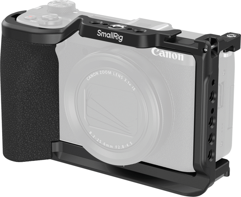 Canon PowerShot V1 este o cameră vlog compactă cu capabilități video avansate – cage-ul SmallRig 5807 transformă această cameră într-un setup de filmare profesional, adăugând mâner ergonomic pentru filmare cu mâna liberă, cold shoe pentru microfon wireless (DJI Mic 2, Rode Wireless Go) și posibilitatea de a monta o lumină de umplere (SmallRig ID 4660 sau similar). Acest setup complet rămâne suficient de compact și ușor pentru a fi purtat zilnic și folosit în orice situație, de la vloguri de stradă la recenzii de produse filmate la birou.