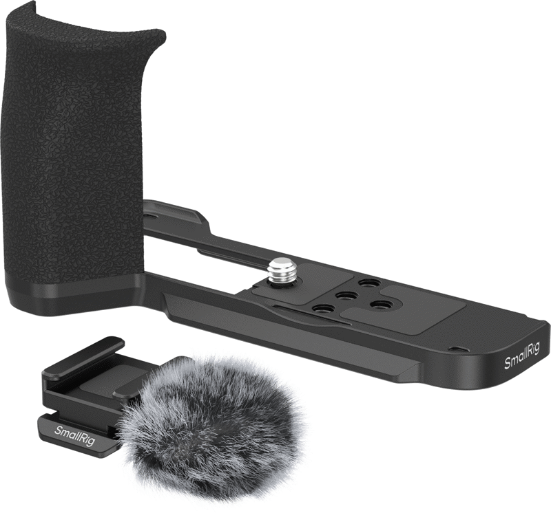 Accesoriul îmbracă partea de jos și laterală a camerei, dar fără a bloca accesul la butoane, la ecranul rabatabil sau la standul integrat al camerei. Poți folosi în continuare piciorușul de sprijin al camerei Canon V1 fără a demonta grip-ul SmallRig. Include și două protecții de vânt (wind muffs) care se montează magnetic sau adeziv (în funcție de lot), rezolvând problema sunetului în vânt.
