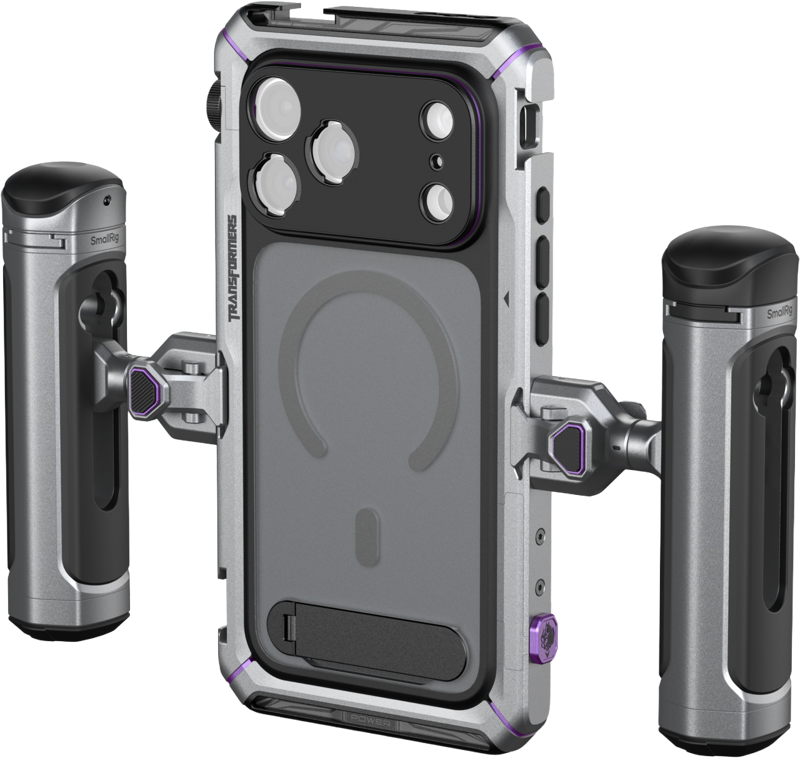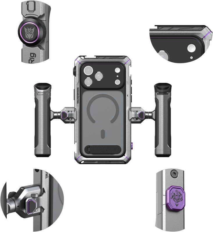 SmallRig 5584 este primul kit de filmare mobilă din colaborarea SmallRig × Transformers, cu un design de produs inspirat de Megatron – textura Decepticon caracteristică acoperă cage-ul și mânerele, creând un setup vizual distinctiv care combină caracterul personajului cu o experiență de utilizare plăcută. Finisajul metalic în tonuri gri-purple cu textura reliefată Decepticon face ca kitul să iasă imediat în evidență pe set și pe rețelele sociale, transformând iPhone 17 Pro Max dintr-un telefon de zi cu zi într-un instrument de producție video cu personalitate. Designul nu este pur estetic: aliajul de aluminiu utilizat pentru structura principală asigură protecție completă, absorbție a șocurilor și rezistență la zgârieturi – caracteristici esențiale la utilizare intensivă în teren.