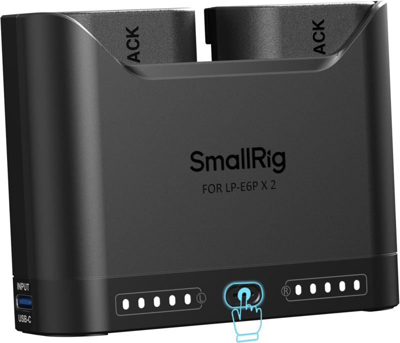 Verificare Instantanee Fără Priză (Offline Check): O inovație SmallRig. Nu știi care baterie din geantă e încărcată? Introdu-o în slot și apasă butonul. Cele 5 LED-uri se vor aprinde instantaneu pentru a indica nivelul (20%, 40%, 60%, 80%, 100%), folosind energia reziduală a bateriei.