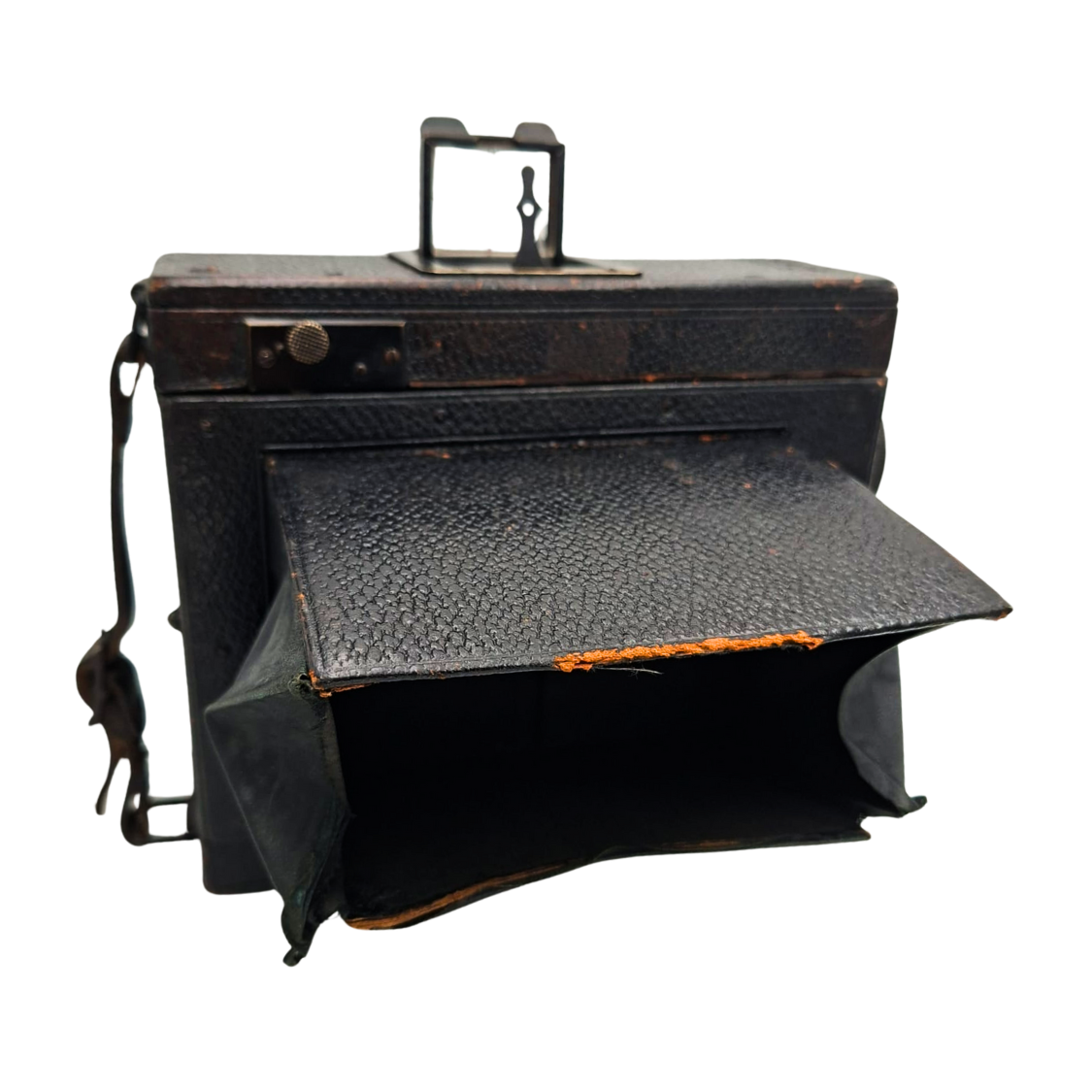 • Estetică Industrială: Corpul este o cutie robustă, îmbrăcată în piele neagră, cu elemente metalice vopsite sau nichelate și un burduf de vizualizare (hood) înalt, din piele, care se pliază compact.