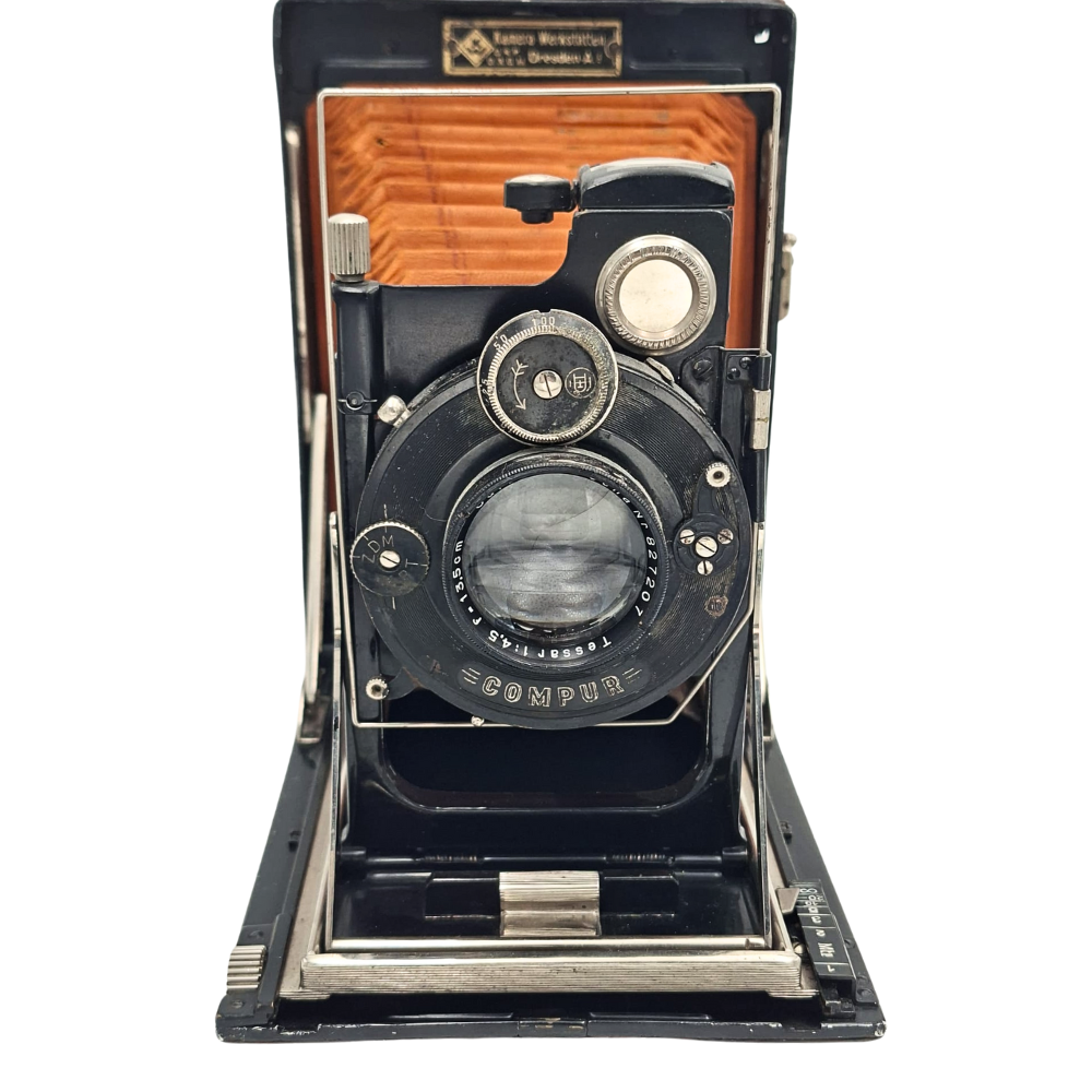 Exemplarul este dotat cu "Ochiul de Vultur" – obiectivul Carl Zeiss Jena Tessar 1:4.5 f=13.5cm. Tessar-ul este renumit pentru contrastul și claritatea sa, fiind standardul profesional al epocii. Obiectivul este montat într-un obturator central Compur (renumit pentru precizie), care oferă timpi de expunere variați (de regulă 1 sec - 1/200 sec, plus B și T), permițând control creativ total.