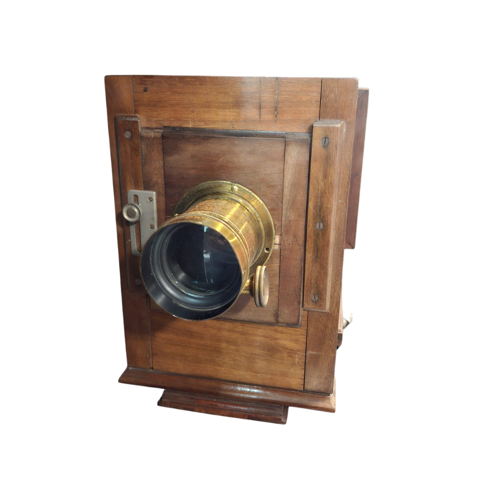 Mecanism de Focalizare: Partea frontală este echipată cu un burduf din material textil negru, permițând ajustarea precisă a focalizării printr-un mecanism pe șine din lemn. Prezența acestui burduf indică o flexibilitate optică avansată pentru acea perioadă.