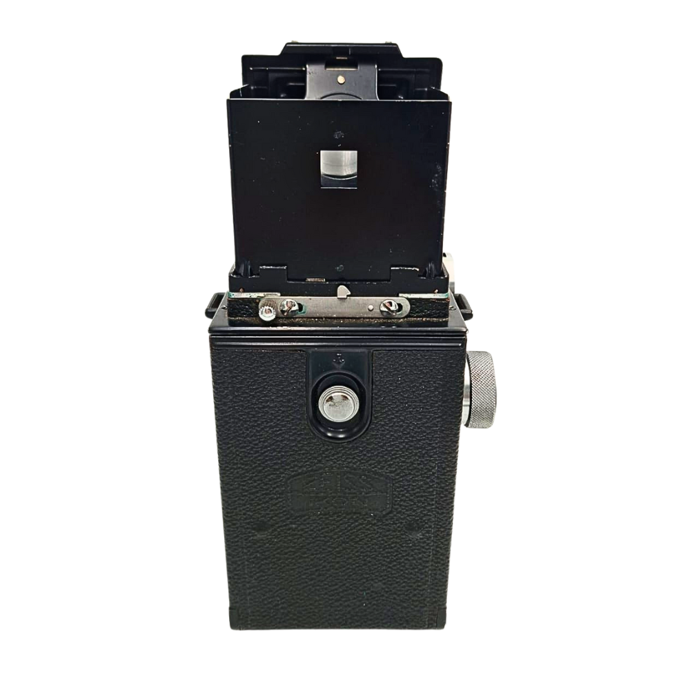 Sistem TLR (Twin Lens Reflex): Vizarea se face "de la nivelul brâului" (Waist Level Finder). Privești de sus în jos în vizorul aparatului, ceea ce oferă o perspectivă unică și discretă, ideală pentru fotografia de stradă candidă.