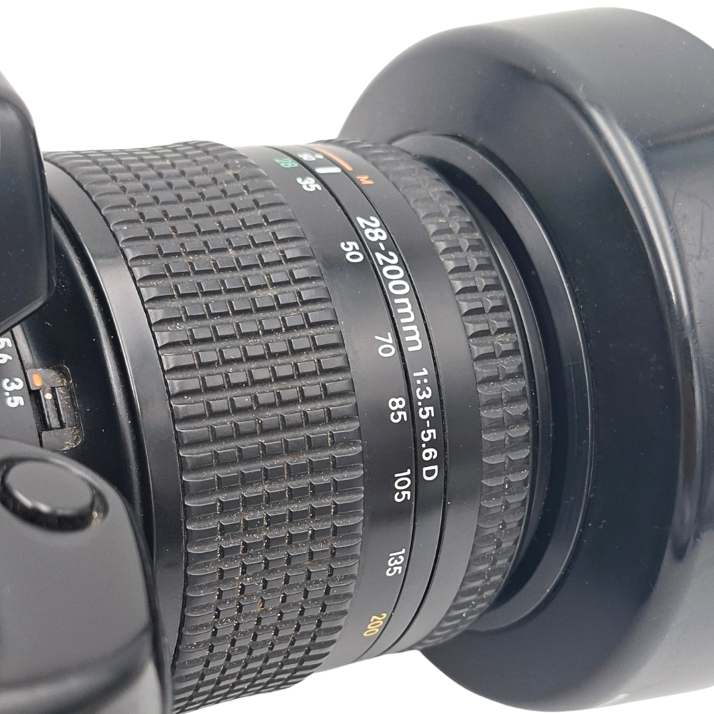 Kitul include obiectivul AF Nikkor 28-200mm f/3.5-5.6 D, o veritabilă unealtă „all-in-one”. De la cadre largi de 28mm, perfecte pentru peisaje și arhitectură, până la apropieri tele de 200mm pentru portrete și detalii, acest obiectiv elimină necesitatea de a schimba lentilele pe teren. Litera „D” (Distance) din denumirea obiectivului este crucială: transmite informații despre distanța de focalizare către procesorul aparatului, activând faimosul sistem de măsurare a expunerii 3D Matrix Metering de la Nikon. Rezultatul? Expuneri perfecte pe film, chiar și în condiții de iluminare complexă sau contre-jour.