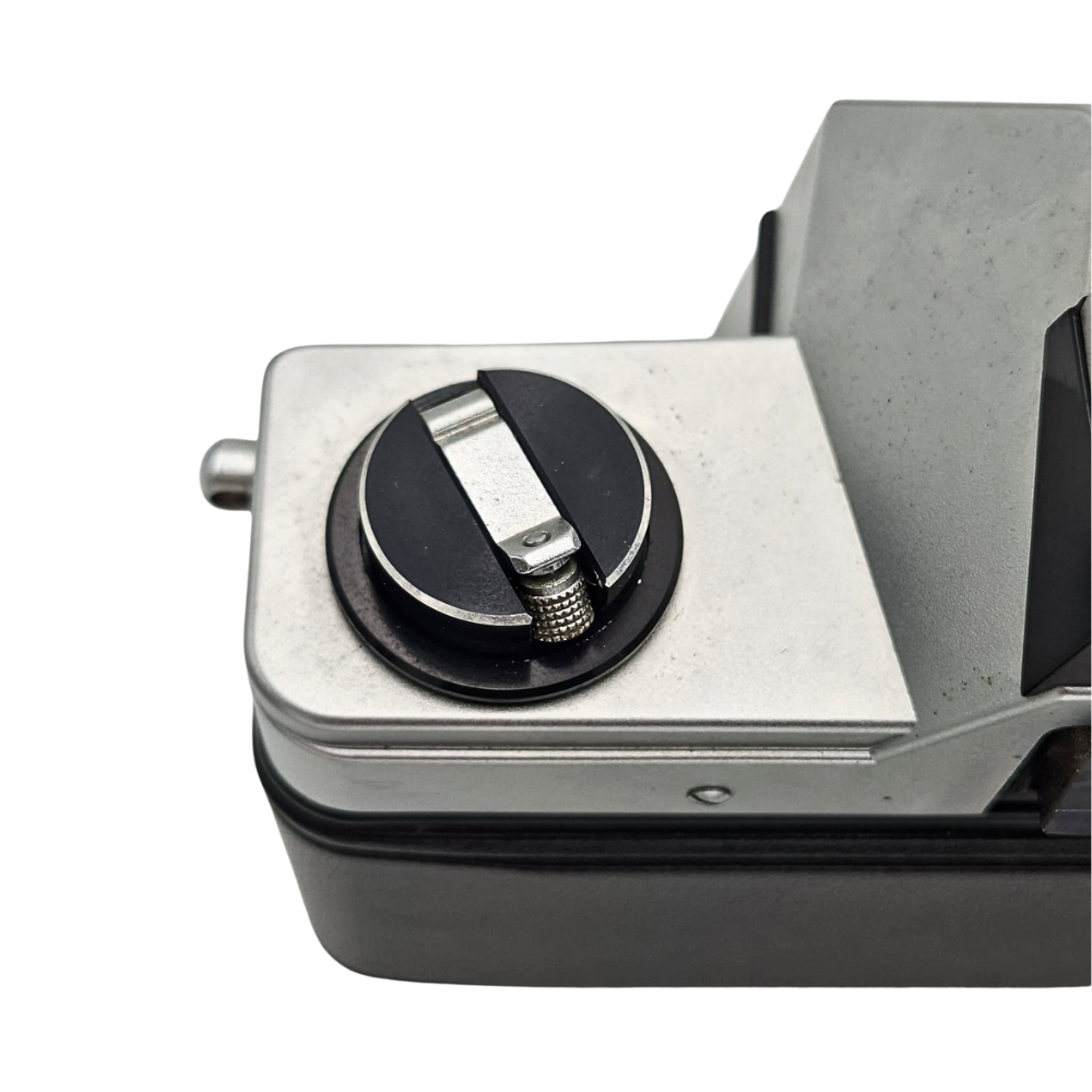 Măsurare "Stop-Down": Sistemul de expunere se activează prin clapeta neagră de lângă declanșator. Aceasta închide diafragma obiectivului montat pentru a citi lumina reală, indicând expunerea prin acul din vizor (+/O/-).