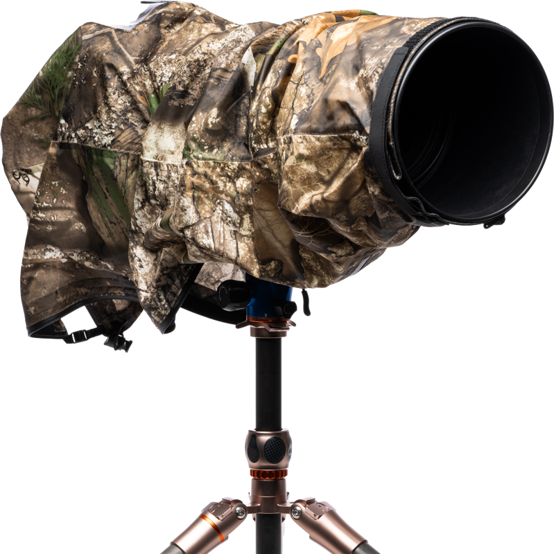 Fotografii de wildlife profesioniști care lucrează cu configurații Canon EOS R3 + 600mm f/4, Nikon Z9 + 500mm f/4 sau Sony A1 + 400mm f/2.8 beneficiază de la varianta Large RealTree APX Camo atât protecție contra ploii pentru echipament de zeci de mii de euro, cât și camuflaj vizual față de subiecții la care au lucrat ore sau zile întregi pentru a se apropia. O ploaie neașteptată poate rata momentul decisiv dacă fotograful trebuie să retragă echipamentul – husa Large permite continuarea fotografierii în condiții de precipitații moderate.