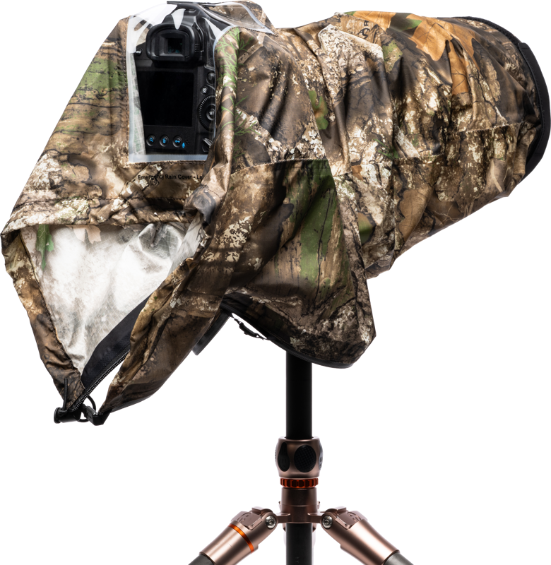 Think Tank Emergency Rain Cover I în modelul RealTree APX Camo (camuflaj) – varianta Large – este o husă de ploaie de urgență proiectată pentru camerele DSLR și mirrorless echipate cu obiective super-telephoto de dimensiuni mari: 150-600mm, 200-500mm, 200-400mm f/4, 400mm f/2.8, 500mm f/4 și 600mm f/4. Fabricată din material 70D Taffeta cu sigilare a cusăturilor (seam-sealed) și tratament DWR (Durable Water Repellent), husa protejează camera și obiectivul de ploaie, ceață, zăpadă, nisip și praf în câteva secunde. Fereastra LCD supradimensionată permite monitorizarea completă a ecranului și a butoanelor camerei fără a scoate echipamentul din husă. Când nu este folosită, se comprimă în buzunarul de transport inclus – suficient de compact pentru a fi transportat permanent în orice rucsac sau geantă foto.
