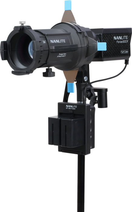NANLITE Forza 60CR LED Color Spot Light with 19°&36° Projection Attachment este kitul complet pentru operatorul care are nevoie de un spotlight RGBLAC compact, puternic și wireless în același pachet cu un atașament de proiecție profesional pentru proiecție de forme, gobos și lumini de efect dramatic. Forza 60CR combină motorul RGBLAC de 6 chips — red, green, blue, lime, amber, cyan — cu LumenRadio CRMX integrat direct în carcasă (fără receptor extern) și cu o construcție de 0.8kg în aluminiu de 88W care poate fi alimentată de la priză AC, de la baterie NP-F dual sau de la baterie V-mount. CRI 96, TLCI 95 și TM-30 Rg 100 asigură o redare a culorii la nivelul surselor premium de cinema pe toată plaja de 1.800–20.000K. Atașamentul de proiecție PJ-FMM-1936 — cu lentile asferice coatate 19° și 36°, 4 shutter slides reglabile și gobo holder — transformă Forza 60CR dintr-un spotlight de iluminare în un instrument de proiecție de lumini de efect cu output de până la 17× mai luminos față de bare fixture, depășind performanța de proiecție a unui fresnel FL-11. Gripul NP-F750 dual și adaptorul Bowens sunt incluse în kit pentru portabilitate și versatilitate maximă.