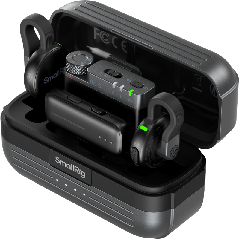 Fiecare transmițător oferă 8 ore pe o singură încărcare. Carcasa de încărcare inclusă extinde autonomia totală a sistemului la 40+ ore, suficient pentru mai multe zile de filmare fără a fi nevoie de priză.