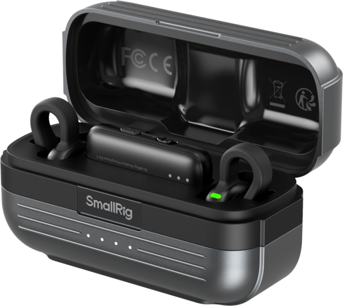 Fiecare transmițător SmallRig S70-C2 oferă până la 8 ore de funcționare continuă per încărcare – suficient pentru o zi completă de filmare. Carcasa de încărcare inclusă în kit extinde autonomia totală la peste 40 ore (dimensiuni carcasă: 94.0 × 52.0 × 40.4mm, greutate: 129.2g) – echivalentul a 2–3 zile de filmare intensă fără acces la priză, transmițătoarele reîncărcându-se în carcasă între sesiunile de utilizare. Autonomia de 40+ ore plasează S70-C2 semnificativ înaintea DJI Mic Mini (18 ore total cu carcasă) și Hollyland Lark M2 (32 ore total cu carcasă). Carcasa se reîncarcă prin USB-C (cablu USB-C inclus în kit).