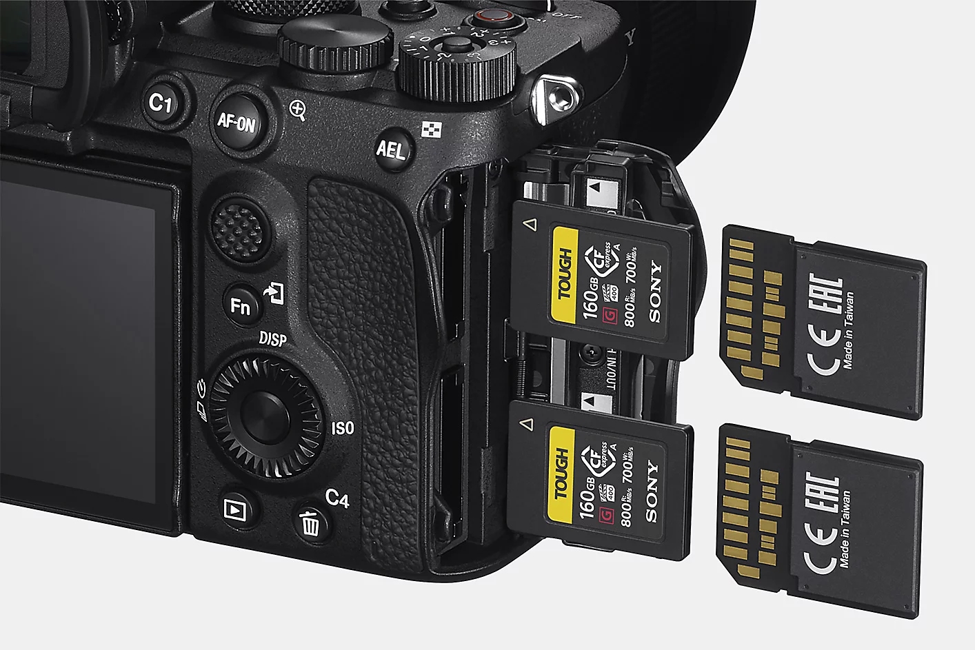 Ambele fante de card acceptă carduri CFexpress tip A ultrarapide, permițând înregistrare la frecvență de biți ridicată și golire rapidă a memoriei tampon, precum și carduri SDXC UHS-II. Sunt disponibile și înregistrări în paralel și cu retransmitere.