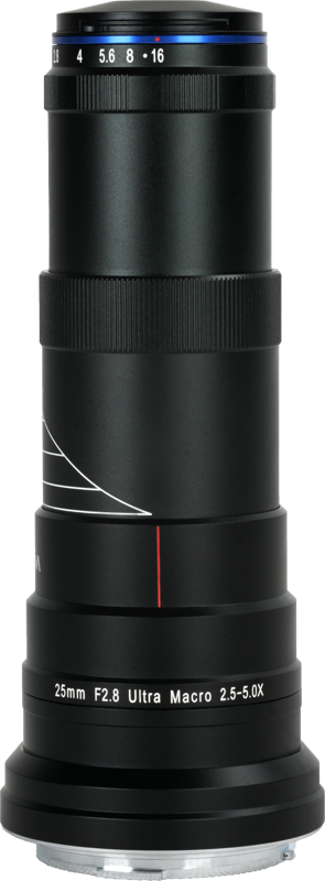 În mod tradițional, pe sistemul Canon, pentru a atinge o mărire de 5:1, fotografii erau nevoiți să recurgă fie la un sistem masiv cu burduf (bellows) și inele inversoare, fie la celebrul obiectiv DSLR Canon MP-E 65mm. Laowa 25mm f/2.8 aduce această performanță direct pe sistemul mirrorless RF: este mult mai accesibil, cântărește doar aproximativ 400g (față de MP-E care este masiv) și se adaptează nativ sistemelor moderne Canon (R, R5, R6, RP etc.), scutindu-te de utilizarea inelelor adaptoare voluminoase.