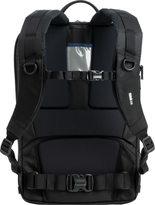 Think Tank Shape Shifter 37L include un set complet de elemente de ergonomie și utilitate: centură talie detașabilă (removable waistbelt) pentru distribuirea greutății echipamentului pe șolduri la purtare prelungită — compatibilă cu Pro Speed Belt Think Tank prin canalul dedicat belt pass-through; bretea sternală ajustabilă (adjustable sternum strap) pentru stabilizarea rucsacului pe corp la mers rapid sau teren accidentat; D-ring-uri pe curelele de umăr pentru atașarea accesoriilor (SmallRig, Peak Design, Joby etc.); pass-through pentru mânerul trolley-ului de bagaj (luggage handle pass-through) pentru fixarea pe valize în aeroporturi; și priză de trepied/monopod/light stand (multipurpose tripod cup) pe lateralul inferior al rucsacului. Buzunarul de securitate ascuns (hidden security pocket) pe spatele rucsacului (între spate și spinare) oferă stocare sigură pentru documente, pașaport sau valori în deplasare — inaccesibil persoanelor din spatele purtătorului. Portul dedicat cardului de vizită (dedicated business card holder) pe exteriorul rucsacului permite identificarea rapidă a proprietarului în aeroporturi, conferințe sau licitații de presă.
