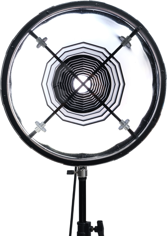 Direcționând fasciculul de 8° al FE30 pe un reflector CRLS (LightBridge sau echivalent), operatorii de iluminat obțin o sursă de lumină moale, mare, omogenă, cu o eficiență semnificativ mai mare față de folosirea bare light-ului sau a reflectorului standard 25° în același setup CRLS. Fasciculul cvasi-paralel de 8° acoperă uniform o arie mai concentrată a reflectorului CRLS, producând o reflexie mai uniformă și mai intensă față de un fascicul divergent de 25–45° care se dispersează pe o arie mai largă a reflectorului cu o eficiență mai scăzută la centru. Rezultatul: Evoke 150C + FE30 + CRLS produce o sursă mare moale comparabilă ca output cu un softbox mult mai puternic.