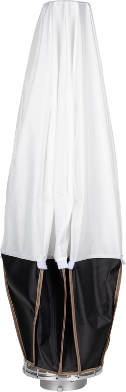 Dimensiuni pliate 180 × 180 × 815 mm și greutate de 1348 g – compact și ușor de transportat în geanta inclusă. Desfășurat, RA-L65 ocupă 650 × 650 × 550 mm – suficient pentru a produce o lumină sferică la scară largă cu un diametru mai mare decât cel al majorității octabox-urilor de 60 cm. Pliat, se reduce la 180 × 180 × 815 mm – un tub subțire de aproximativ 81 cm lungime, compatibil cu genți standard de studio. Greutatea de 1348 g îl face ușor de transportat și de echilibrat pe un stand de lumini standard fără contragreutăți excesive. Geanta de transport inclusă protejează softbox-ul în deplasare și simplifică depozitarea.