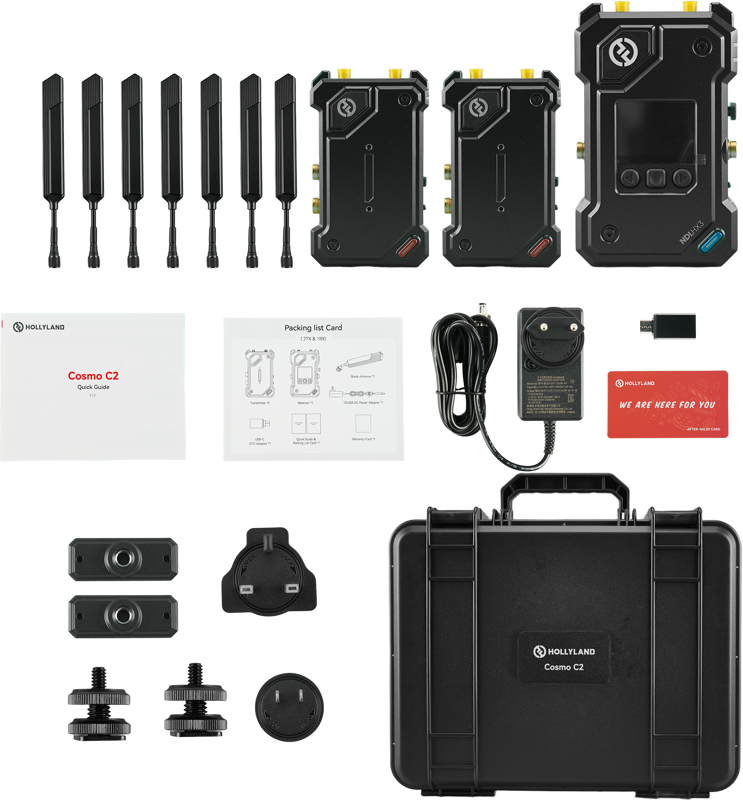 Transmisie video wireless de nivel superior pentru producții cu mai multe camereFlux de lucru wireless fără întreruperi pentru mai multe camereKitul Hollyland Cosmo C2 2TX & 1RX este conceput pentru a revoluționa transmisia live cu mai multe camere, producția electronică de teren (EFP) și transmisia profesională. Cu configurația sa cu două transmițătoare și un singur receptor, acest sistem elimină aglomerarea cablurilor, întârzierile de sincronizare și constrângerile spațiale cu care se confruntă în mod obișnuit configurațiile tradiționale.Permițând ca două transmițătoare să trimită semnale video către un singur receptor, Cosmo C2 asigură o sincronizare perfectă între fluxurile camerelor, reducând timpul de instalare și crescând eficiența pentru acoperirea evenimentelor live, filmare și producții comerciale.Performanță de transmisie wireless de neegalatRază de acțiune și stabilitate superioare: Cosmo C2 oferă o rază de transmisie wireless de până la 1.000 de metri (line-of-sight) și o distanță de transmisie back-to-back de peste 300 de metri.Ultra-Low Latency: Cu o latență de doar 33 milisecunde, sistemul depășește configurațiile convenționale de 60ms, asigurând o sincronizare audio-video precisă - esențială pentru ecranele LED și producțiile live.Tehnologie avansată HEVO 2.0: Acest sistem detectează automat interferențele și comută fără probleme pe un canal curat, eliminând bâlbâiala video, cadrele pierdute sau pierderea semnalului în medii RF cu trafic intens.Capabilități video și audio de nivel profesionalTransmisie Full HD: Suportă 1080p60, 1080p50, 1080p30 și alte rate de cadre cu degradare zero a imaginii.** Algoritm de compensare a ratei cadrelor:** Netezește intrările cu rate scăzute ale cadrelor la 60P, asigurând o mișcare fluidă în medii cu ritm rapid.Transmisie audio fără pierderi: Livrează audio încorporat pe 2 canale 48 kHz pe 24 de biți, păstrând calitatea sunetului de înaltă fidelitate pentru fluxurile de lucru de difuzare și post-producție.Conectivitate versatilă și integrare perfectăSuport dual HDMI & SDI: Sistemul acceptă atât conexiuni HDMI, cât și SDI, făcându-l compatibil cu o gamă largă de camere profesionale, monitoare și switcheri.** Porturi I/O cuprinzătoare:**Transmițător (TX): Intrare HDMI, intrare SDI, SDI LoopoutReceptor (RX): Ieșire HDMI, două ieșiri SDIPlug-and-Play Streaming:Suport NDI pentru streaming continuu în rețeaua locală (LAN) fără convertoare suplimentare.Suport UVC prin USB-C pentru streaming direct de pe computer - nu este necesară o placă de captură.SalireRTMP pentru streaming instantaneu în cloud, ocolind codificatoarele externe.Construit pentru producții de teren și studioDesign robust și ușor: Șasiu metalic compact, dar durabil, rezistent la medii de producție solicitante.Opțiuni flexibile de alimentare:Transmițătoare: Suportă atât curent continuu, cât și baterii NP-F.Receptor: Compatibil cu alimentare DC și baterii V-Mount.Gestionarea inteligentă a energiei: Asigură funcționarea de lungă durată pentru sesiuni de filmare prelungite.What's in the Box?2× Cosmo C2 TX (emițătoare)1× Cosmo C2 RX (Receptor)2× Plăci de baterie NP-F pentru TX1× placă de baterie V-Mount pentru RX3× seturi de antene1 × adaptor de alimentare DC1× cablu USB-C către USB-CAccesorii de montareCarcasă de transport
