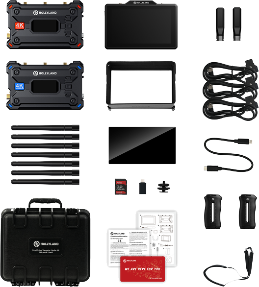 Kit-ul Hollyland Pyro include monitorul transceiver wireless Pyro 5 de 5,5" și transmițătorul/receptorul Pyro S pentru monitorizare ultra-versatilă pe platou. Cu 2,4/5 GHz dual-band auto frequency hopping, 1,300 ft (~400 m) line-of-sight range și ~60 ms ultra-low latency, suportă un emițător streaming la până la patru receptoare. Afișajul la lumina zilei de 1.500 nit, înregistrarea proxy cu timecode, controlul camerei și HDMI / SDI I/O oferă o integrare profesională luminoasă, fără întreruperi.