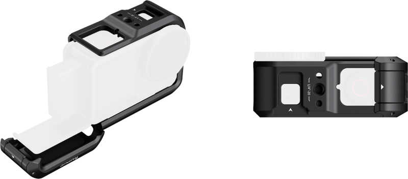 SmallRig 5888 dispune de 2 magnetic quick release mount-uri plasate pe laturile stânga și dreapta ale carcasei, compatibile cu DJI Dual-Direction Quick-Release Adapter Mount original și cu SmallRig Dual-Mount Quick Release Supports (ID 5890, 5779, 5991) — permițând comutarea instantanee între orientarea orizontală (16:9, landscape) și orientarea verticală (9:16, portrait pentru TikTok/Reels/Shorts) fără instrumente și fără demontarea camerei de pe suport. Designul open-base (baza deschisă, fără placă inferioară solidă) oferă acces direct la mount-ul magnetic original al camerei DJI Osmo Action 6 — utilizatorii pot utiliza direct mountul magnetic DJI al camerei prin baza deschisă a carcasei, fără a depinde exclusiv de mount-urile laterale ale carcasei. Quick release mount-ul lateral este detașabil complet cu cheia imbus inclusă, restabilind accesul complet la mount-ul magnetic al camerei și la orice alt sistem de montare non-SmallRig.